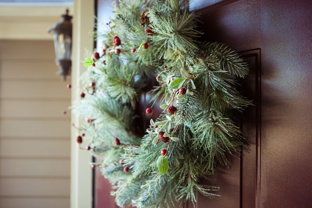 1. Corona Navideña: Coloca una corona navideña en el centro de la puerta. Puedes comprar una ya hecha o hacer la tuya con ramas, piñas y lazos.